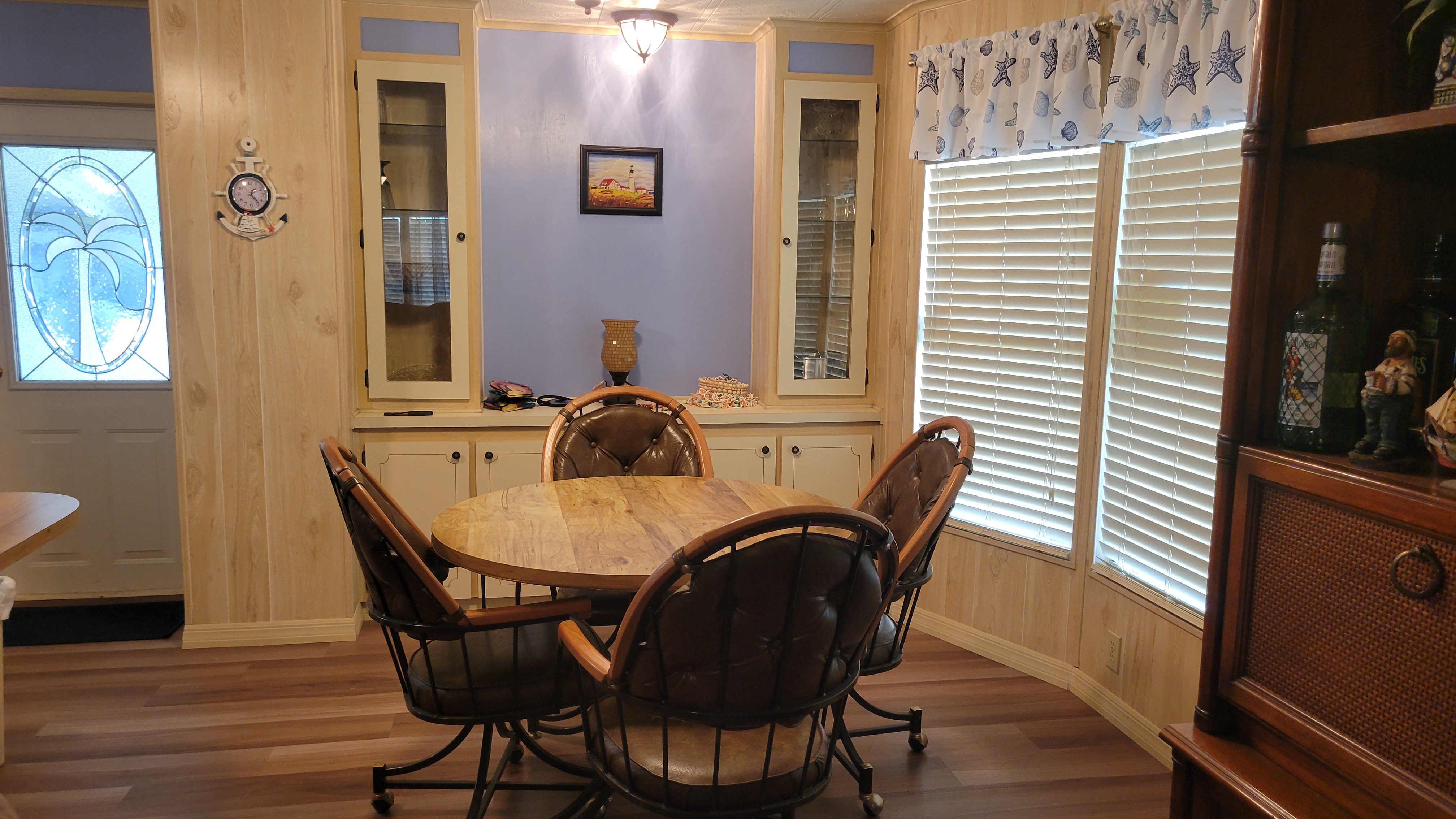 You must see this very nice double-wide home which faces Lake Hamilton, with 2 bedrooms, 2 baths, a large Florida Room (with laundry), a screened porch, and so much more! The home features quality laminate flooring, includes all appliances, and all furniture. The kitchen has a breakfast counter, a pantry and a dishwasher. A 7×14 extension to the living room creates a good-sized living space. The dining area has built-in cupboards and charming rounded (bay) windows facing the front of the house. The Florida Room, with a wall A/C, is about 300 sq ft with a private “nook” which houses the laundry, a spare refrigerator, and extra storage. Golf is cart included. Lovely landscaping. The roof was new in 2024, the A/C is 3 years old.